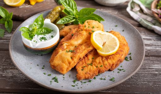 Frische Fisch gebacken mit Reis oder Pommes oder Bratkartoffeln dazu Salat